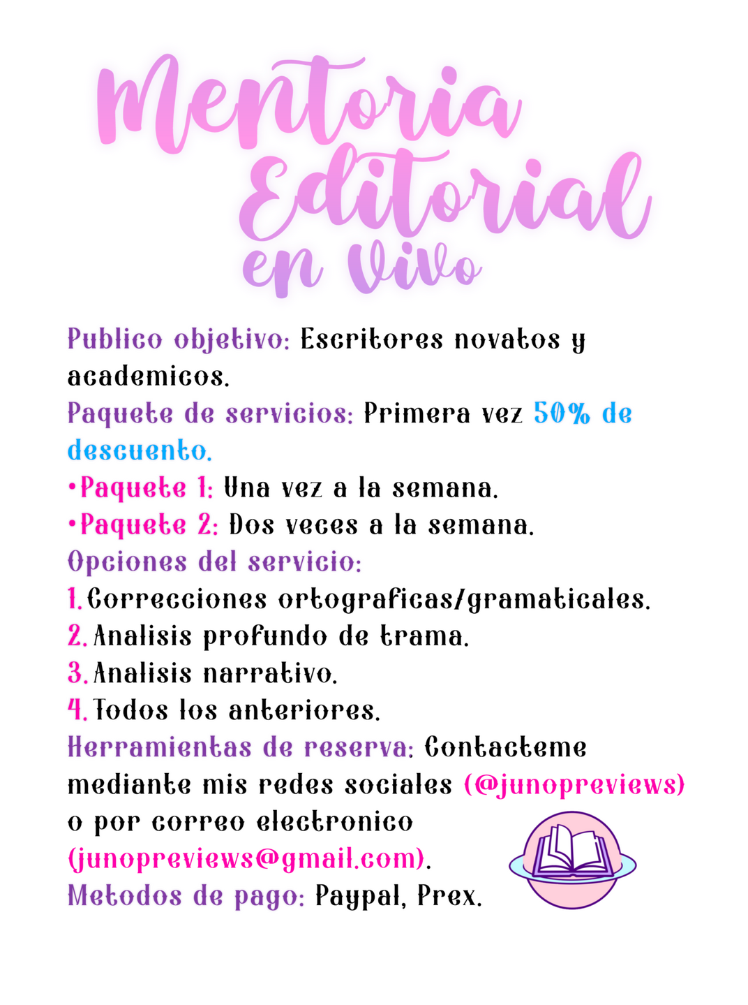 ¿Te gustaría recibir el consejo de un profesional? No te preocupes, acá estamos. Con nuestros servicios de Mentoría de Editorial, te ofrecemos una llamada de una o dos horas (a elección) a través de discord para corregir, analizar la trama y la narrativa de tu obra.